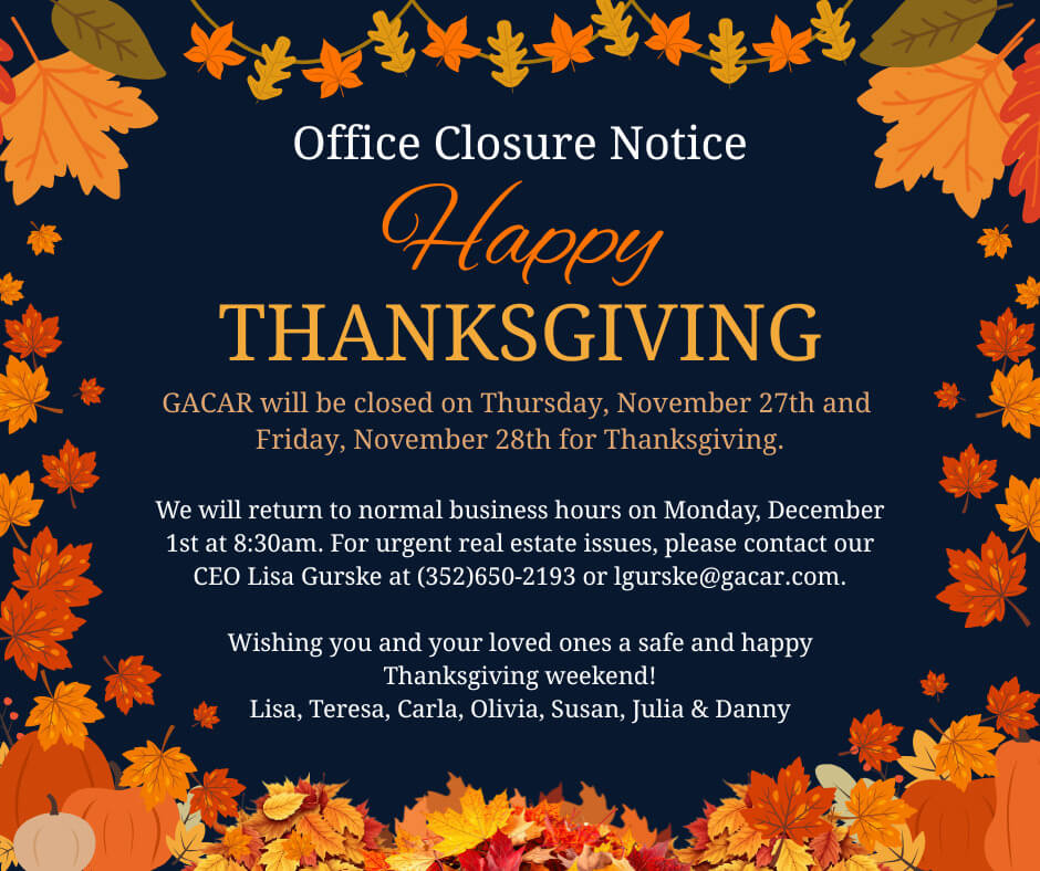We will return to normal business hours on Monday, December 1st at 8:30am. For urgent real estate issues, please contact our CEO Lisa Gurske at (352)650-2193 or lgurske@gacar.com.